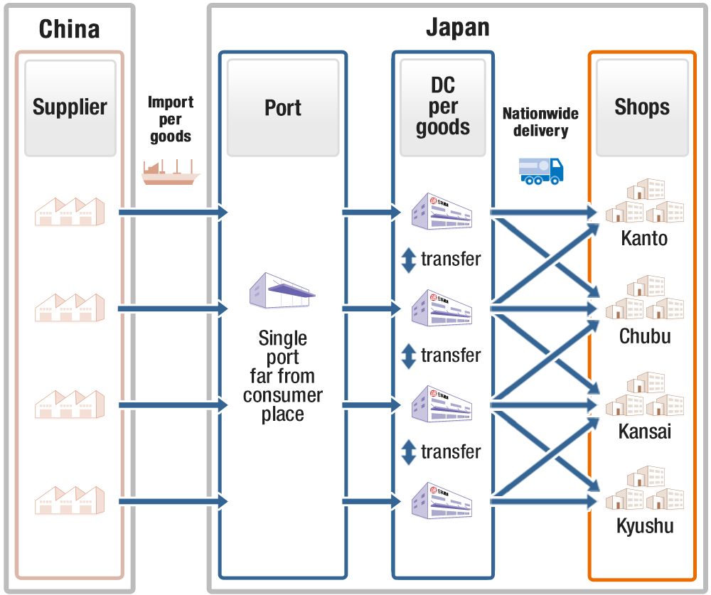 - Reduce shipping costs within Japan by transporting merchandise in international marine containers to the Japan-side DC (total of 4 DCs) closest to the point of consumption.